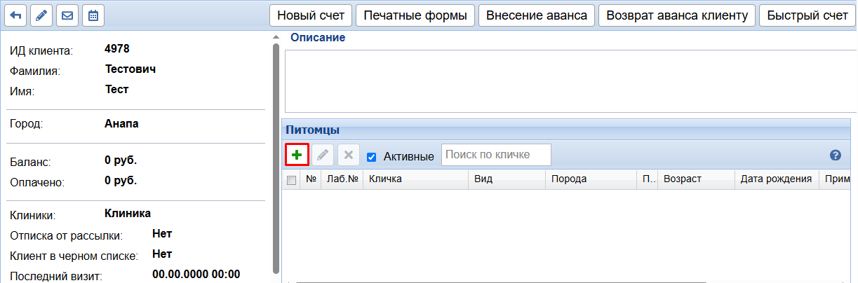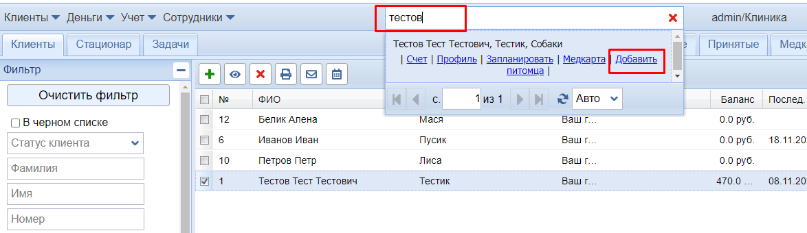 В глобальном поиске введите фамилию клиента и нажмите кнопку Добавить питомца. Откроется форма добавления питомца.
