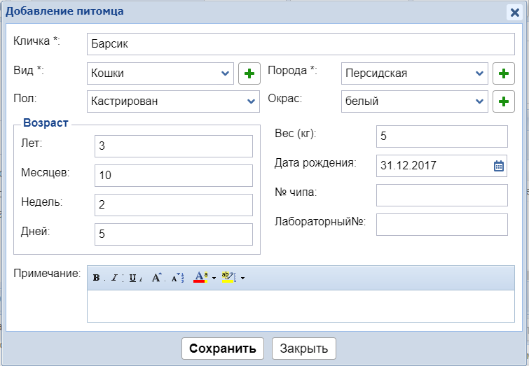 В окне Добавление питомца заполните все обязательные поля (отмечены *):