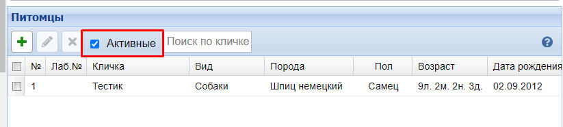 В блоке Питомцы по умолчанию выставлена галочка Активные — это значит, что отображаются активные питомцы. Если галочку убрать, будут отображены питомцы, переданные другому владельцу, умершие и удаленные.