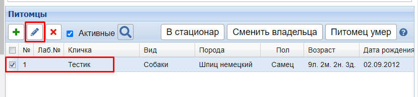 Чтобы отредактировать данные питомца, необходимо выделить его галочкой и нажать на карандаш.