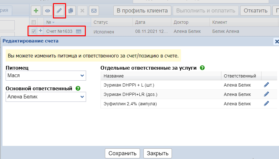 Если нужно исправить только ответственного или питомца, то необходимо выделить нужный счет и нажать кнопку Карандаш (редактировать).