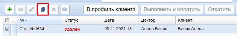 Для внесения изменений в счет (например, если клиент вернул товар или в счете пробили не ту позицию, провели не тем типом оплаты), нужно скопировать удаленный счет, внести необходимые изменения и выполнить его снова. Счет будет проведен текущей датой.