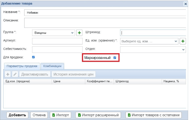 ВАЖНО! Если вы импортируете новые товары в программу, после загрузки при необходимости их нужно отредактировать и проставить галочку “Маркированный”.