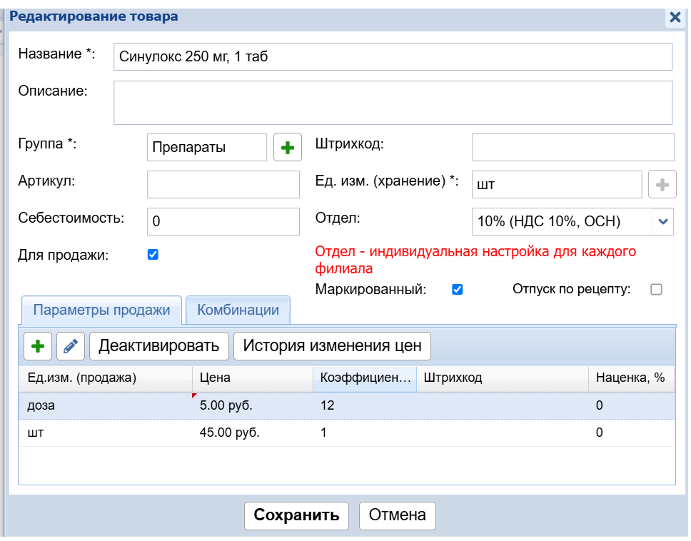 Если отметить чекбокс "Маркированный", то отобразится второй чекбокс "Отпуск по рецепту". По умолчанию он не отмечен. При необходимости его нужно отметить.