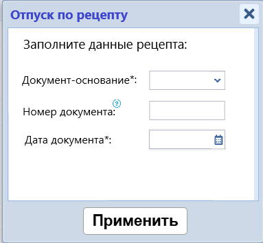 После заполнения при нажатии кнопки Применить значения заполненных полей передается в «Уведомление о реализации», которые соответствуют рецептурному препарату в счете.