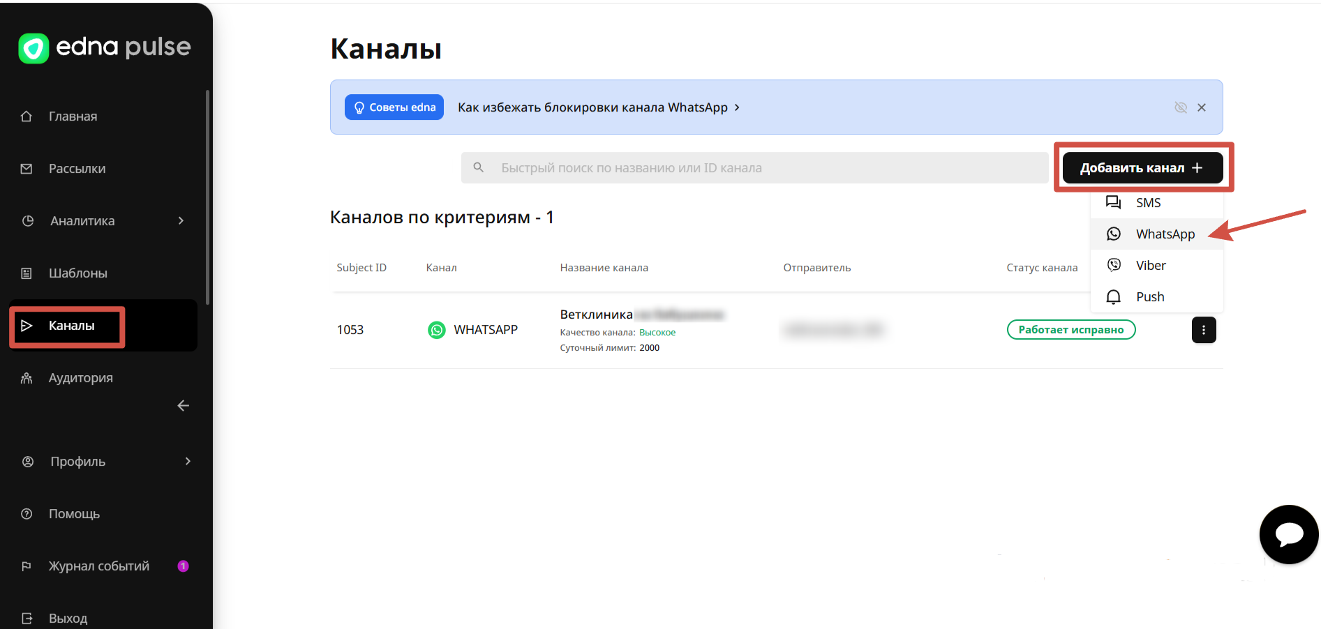 После этого нужно создать новый канал «WhatsApp». Инструкция по созданию канала.