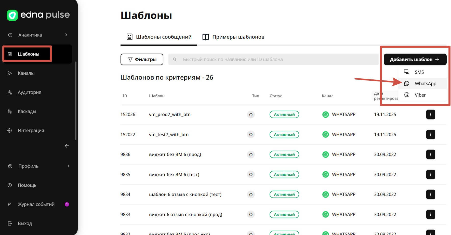 Когда шаблон будет активен, можно отправить тестовое сообщение в настройках интеграции edna.