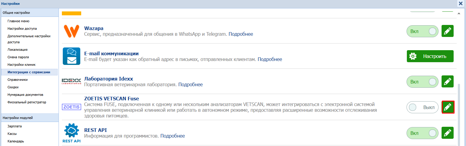 Чтобы настроить интеграцию с Zoetis VETSCAN FUSE, в программе перейдите в Настройки — Интеграция с сервисами — включите интеграцию и нажмите карандаш напротив пункта ZOETIS VETSCAN Fuse.