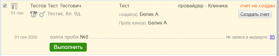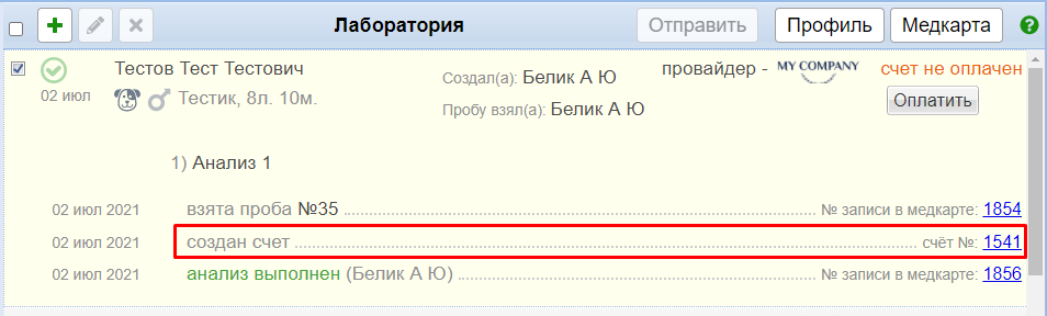 Если при добавлении анализа поставили галочку Создать счет автоматически, при сохранении анализа появится строка с номером созданного счета. Кликнув по номеру, можно перейти в сам счет, отредактировать его, если нужно, и оплатить. В счет автоматически подтянутся товары/услуги, привязанные к проводимому анализу.