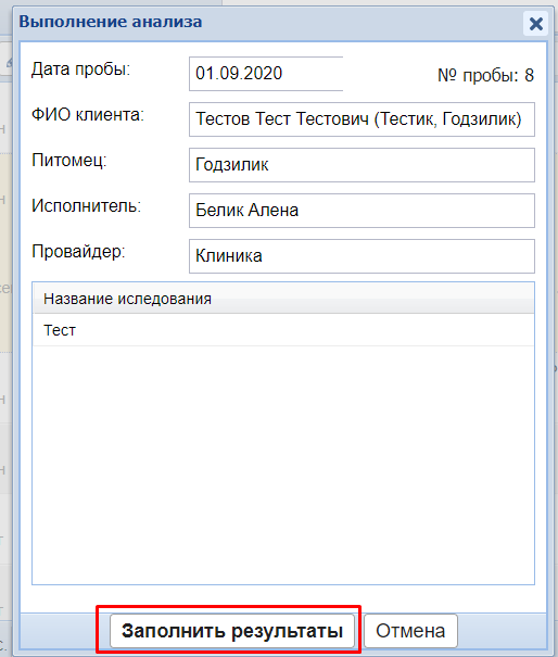 Если анализ проводится в клинике и к нему привязан спецшаблон, при нажатии кнопки Выполнить программа предложит заполнить результаты анализа.