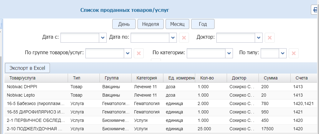 Фильтровать данные в отчете можно: по периоду, доктору, конкретной группе товаров/услуг, категории или по типу — товар/услуга.