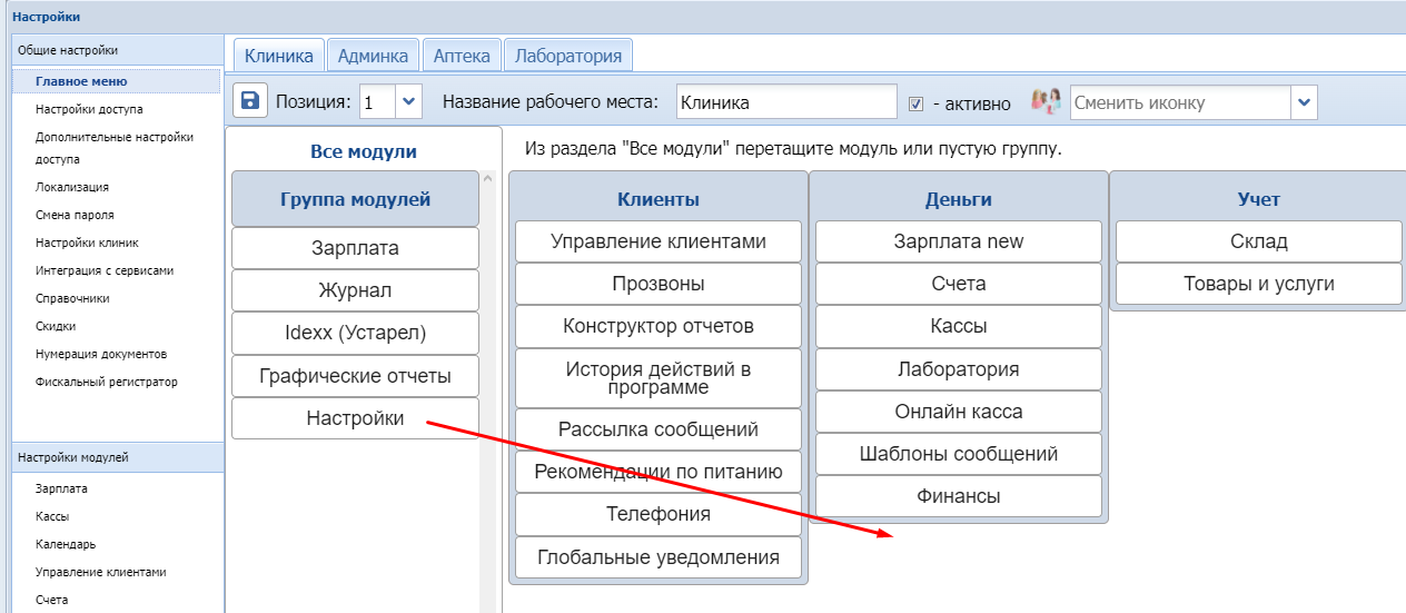 Чтобы добавить модули в нужное рабочее место, нужно открыть вкладку с его названием и из колонки Все модули перенести (перетянуть мышкой) в нужный раздел соответствующие модули. Обязательно сохранить изменение (кнопка с дискетой)