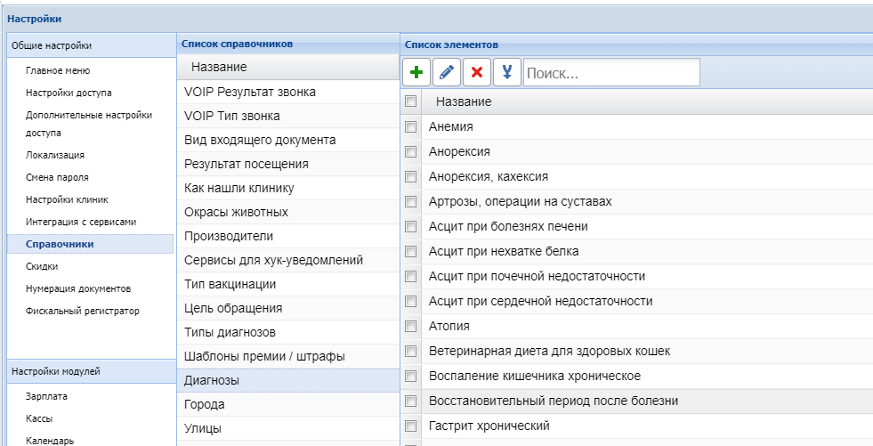 Здесь можно добавить (зеленый плюс), отредактировать (карандаш), объединить или деактивировать (красный крест) значения различных справочников.
