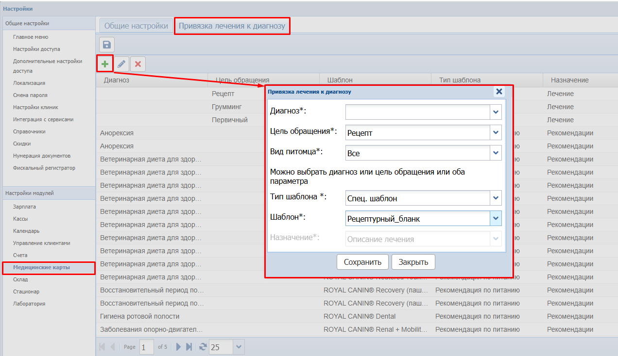 Перейдите в: Настройки → Медицинские карты → Привязка лечения к диагнозу.