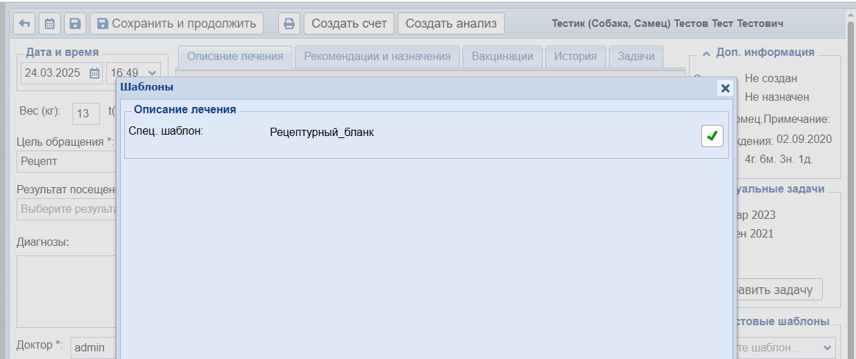 В Ветменеджер можно настроить автоматическую подстановку специсследований или текстовых шаблонов в зависимости от цели обращения или диагноза. Это ускоряет заполнение медкарт и снижает риск ошибок.