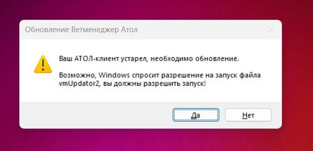 Атол-клиент может предложить автоматически обновиться. При этом в программе появится окно: "Ваш АТОЛ-клиент устарел, необходимо обновление".