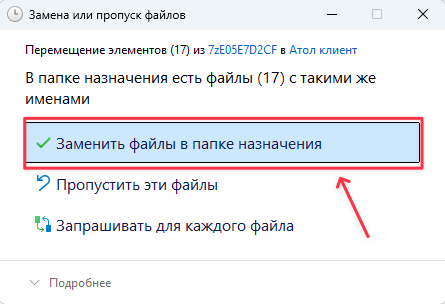 - При появлении запроса на замену файлов подтвердите замену. Если такого сообщения не было, проверьте, все ли файлы были скопированы верно.