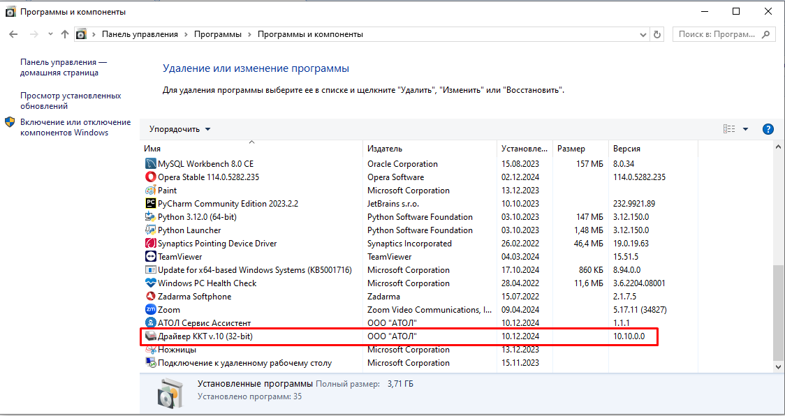 - Откройте Пуск → Панель управления → Программы и компоненты → Драйвер ККТ.