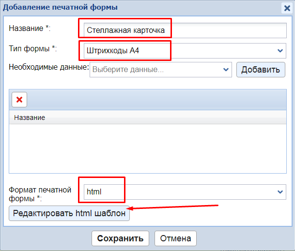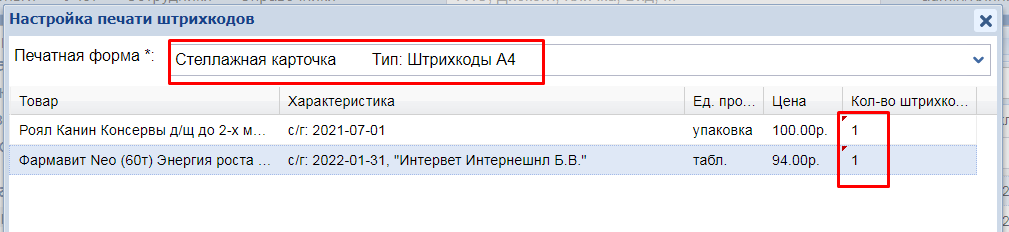 Из списка выбрать добавленную печатную форму. Указать количество этикеток стеллажных карточек на каждое наименование товара.
