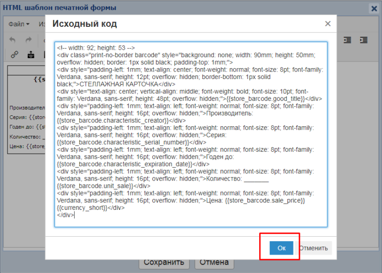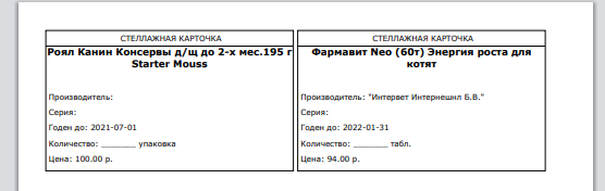 Распечатаются карты с названием товара, заполненными характеристиками и ценой продажи. Количество товара необходимо заполнить вручную после печати.