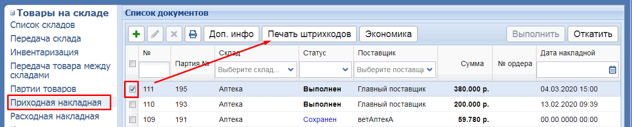 Чтобы распечатать стеллажную карту, перейдите в модуль Склад — Приходные накладные — выбрать нужную накладную нажать кнопку Печать штрихкодов