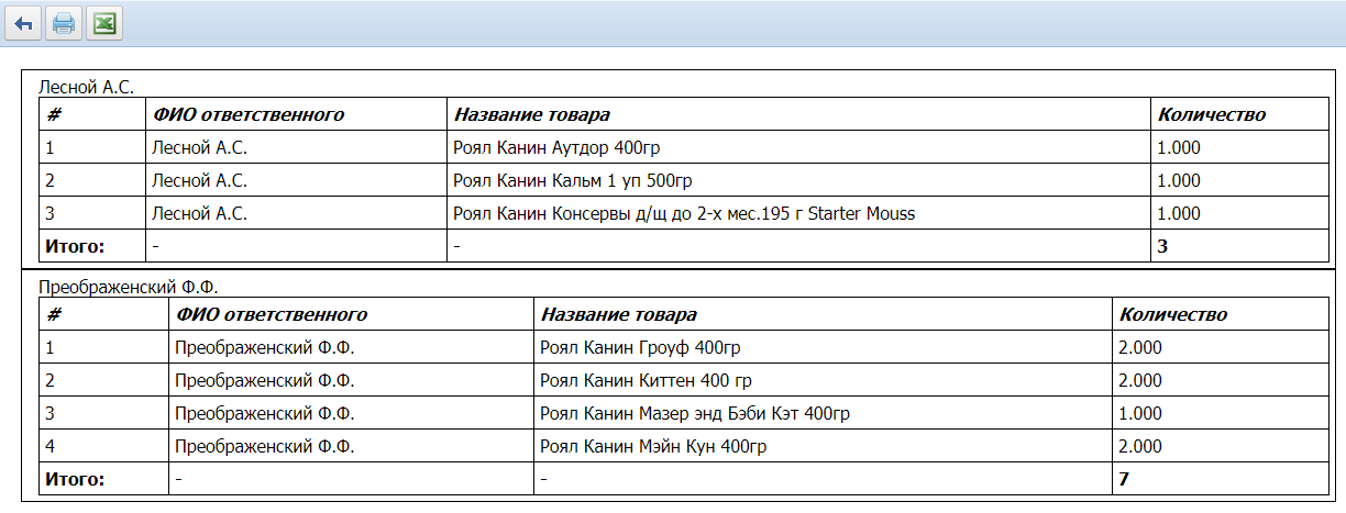Результат отчета Продажи RoyalCanin покажет список фамилий врачей, перечень и количество проданных кормов Роял только по собакам/кошкам за выбранный период.