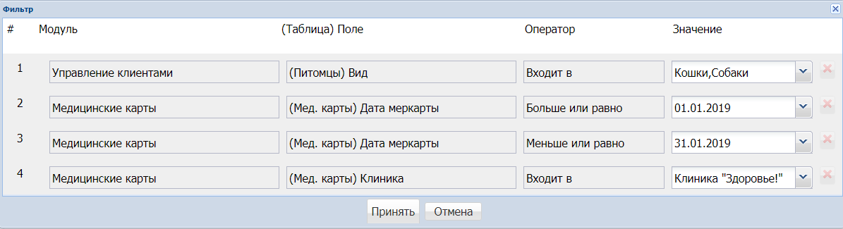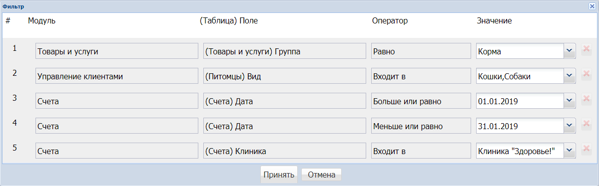 Далее откроется фильтр. Перепроверить правильность заполнения фильтра и нажать кнопку Принять.