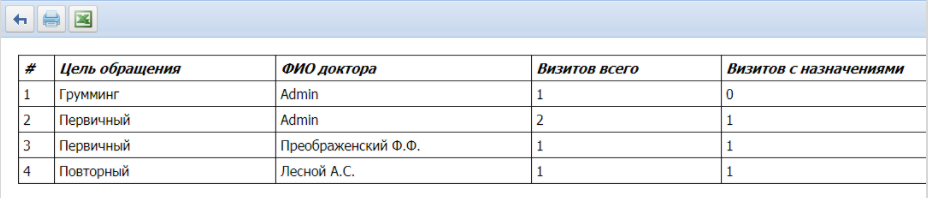 Отчет по назначениям кормов RoyalCanin выводит результат: количество медкарт с назначениями кормов и без назначений по каждому врачу.