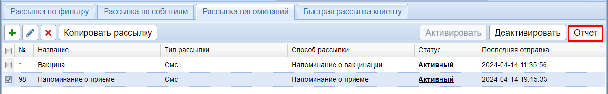В сообщении также указывается название рассылки, в которой замечены ошибки. Чтобы посмотреть, какие ошибки и у каких клиентов возникли, можно кликнуть по названию рассылки или перейти в модуль Рассылки - выделить нужную рассылку и нажать кнопку Отчет.