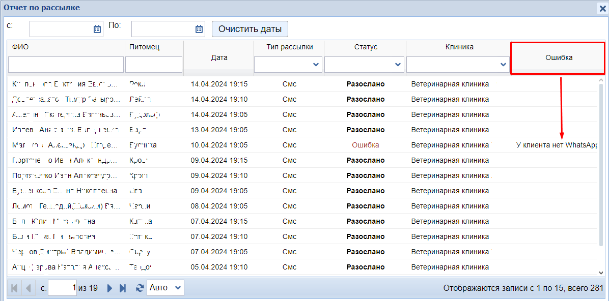 В отчете смотрим столбец Ошибка. Там будет комментарий, по какой причине клиенту (или клиентам) не отправляется сообщение. В ситуации на примере ниже: клиника отправляет сообщения на WhatsApp, а у клиента нет данного мессенджера.