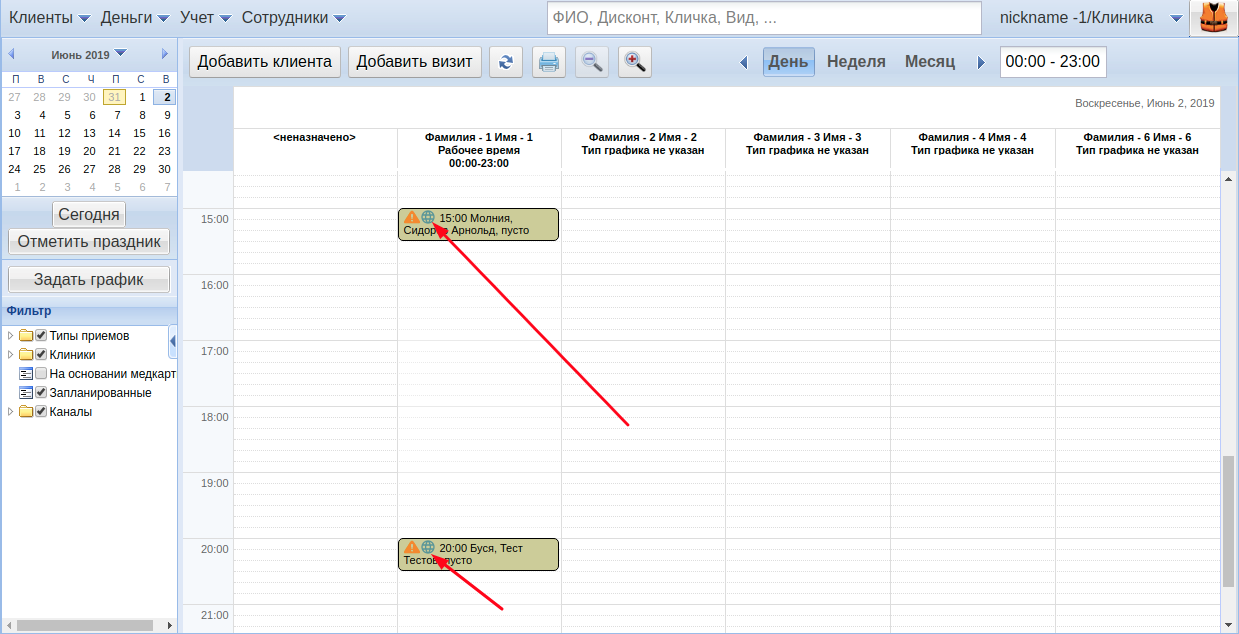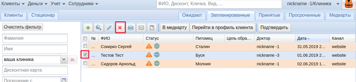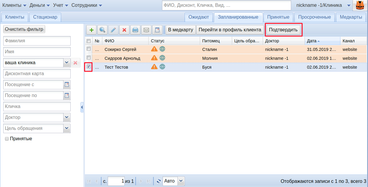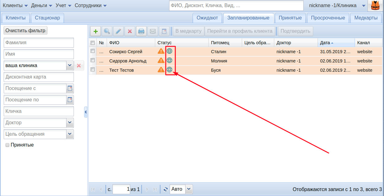 Такие записи на прием находятся в Неподтвержденном статусе. Они расположены во вкладке Запланированные вверху списка и выделены цветом.