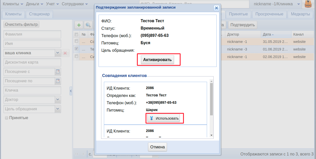 Если запись приема уникальна и совпадения не относятся к текущему клиенту, тогда нажмите кнопку Активировать.