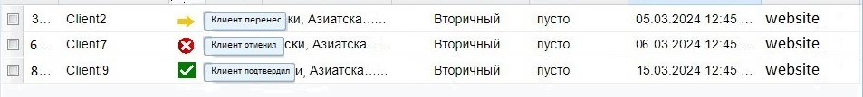 Если у вас настроены уведомления для подтверждения, переноса или отмены записи клиентом, во вкладке "Запланированные" в столбце с иконкой 💬 (облачко с тремя точками) появится пометка, если клиент подтвердил, отменил или перенёс запись.