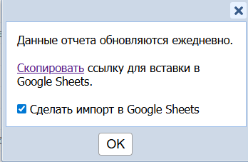 3. Получить результаты отчетов, включить интеграцию отчета с Google таблицами, скопировать формулу.