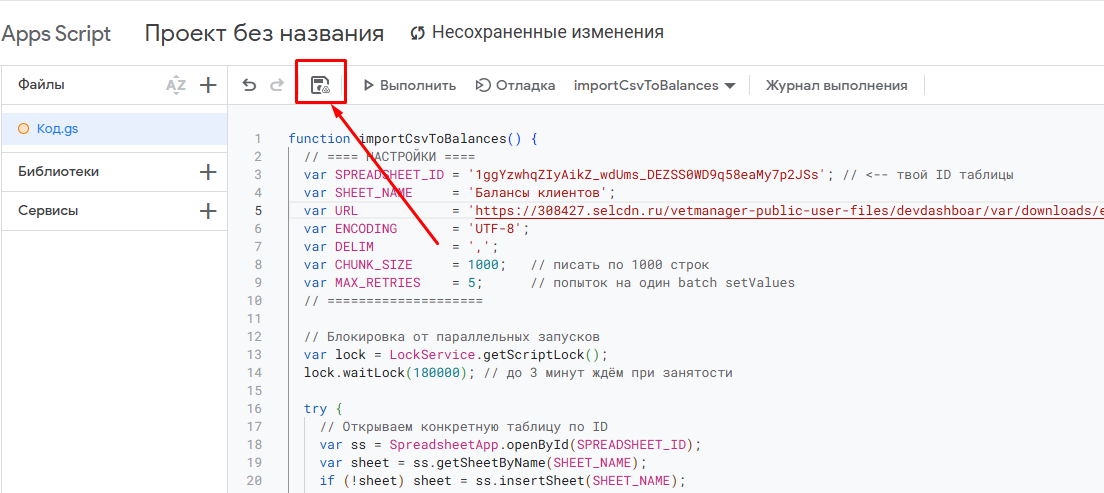 3. В открывшемся окне удаляем размещенный там код и вставляем следующий код из файла importCsvToBalances.txt.
