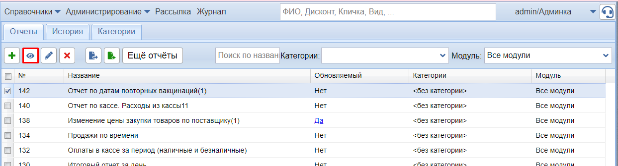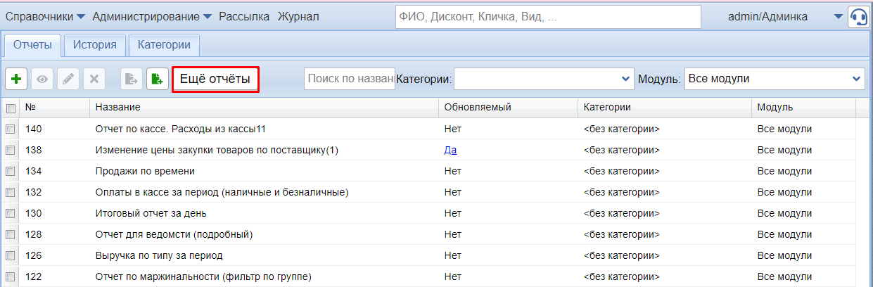 В Админке перейдите в раздел Администрирование - Конструктор отчетов. Здесь расположены стандартные отчеты.