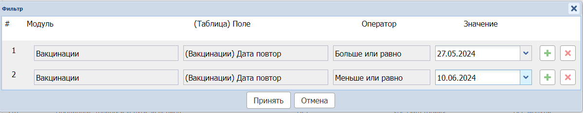 Когда все фильтры установлены, для вывода информации нажмите Принять.