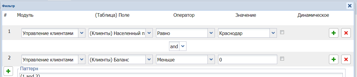 Если мы изменим паттерн к примеру вот так «(1 и (2 или 3))», то программа найдет обязательно всех клиентов у которых город не Краснодар, и есть выполнение любого из критериев 2 или 3.