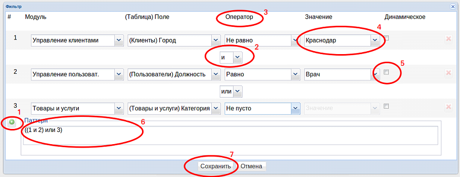 Оператор позволяет наиболее точно отразить критерий. Для числовых полей и полей с датами есть возможность указывать арифметические операции больше либо меньше, для некоторых полей есть возможность задавать параметры через запятую, указывая несколько значений, по которым можно отфильтровать.