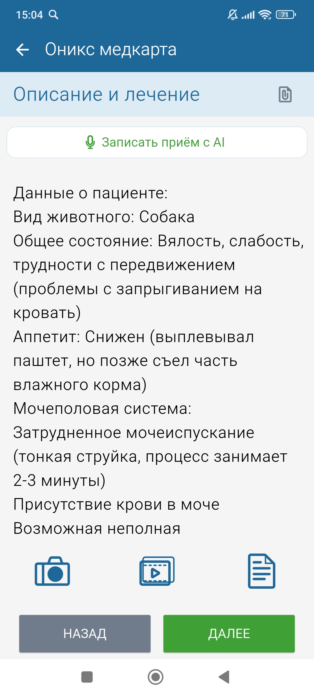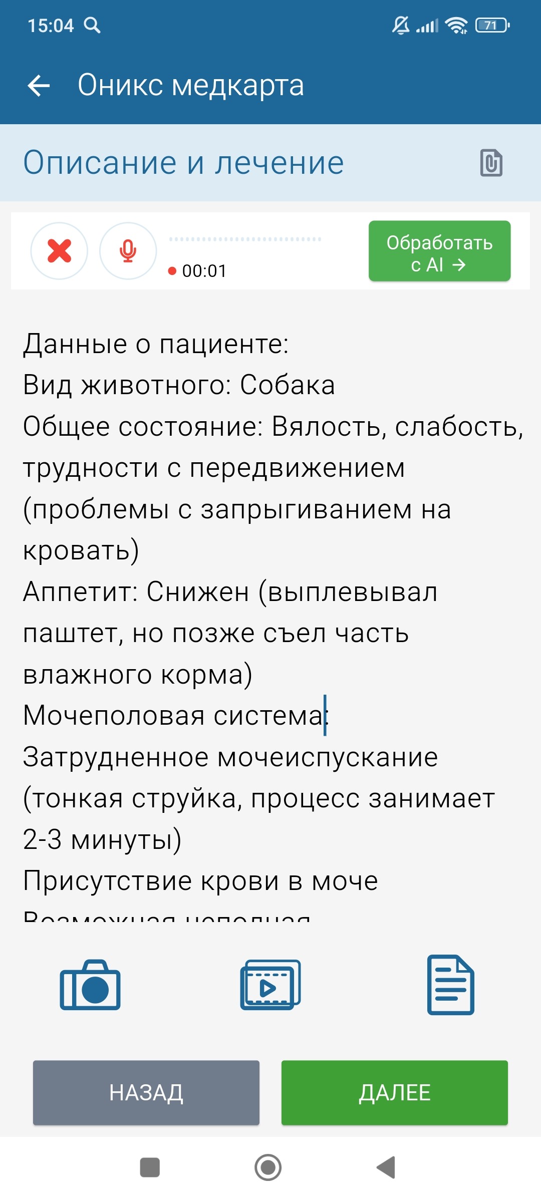 В мобильном приложении от Ветменеджер* появился AI-ассистент в виде голосовой панели в медкарте. Врачу достаточно включить голосовую панель и озвучивать ход приема. Искусственный интеллект анализирует разговор, извлекает ключевые смыслы и автоматически создает структурированный протокол. Доктору остается только проверить и утвердить — и запись сразу попадает в браузерную версию Ветменеджер.