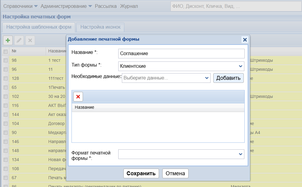3. Поле Необходимые данные определяет, какие данные из программы будут использованы в шаблоне для печати. Например, для распечатки лечебной карты питомца необходимы данные доктора и клиента. Поэтому при создании такой лечебной формы нужно выбрать каждое значение из списка необходимых данных и нажать кнопку Добавить