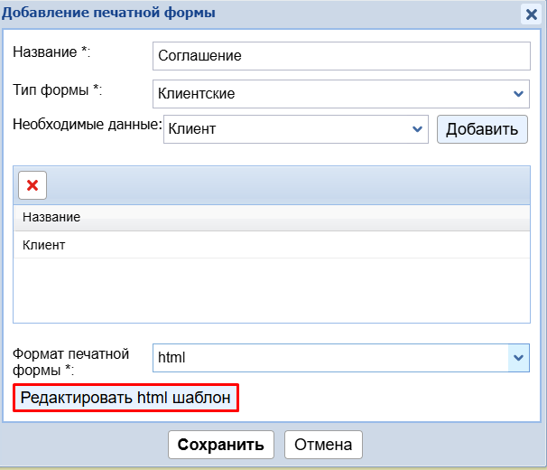 HTML формат указывается, если форма будет создаваться в html. При этом снизу появляется кнопка Редактировать html шаблон. При ее нажатии появится окно с визуальным редактором, в котором можно создать, редактировать и сохранить печатную форму наглядно.