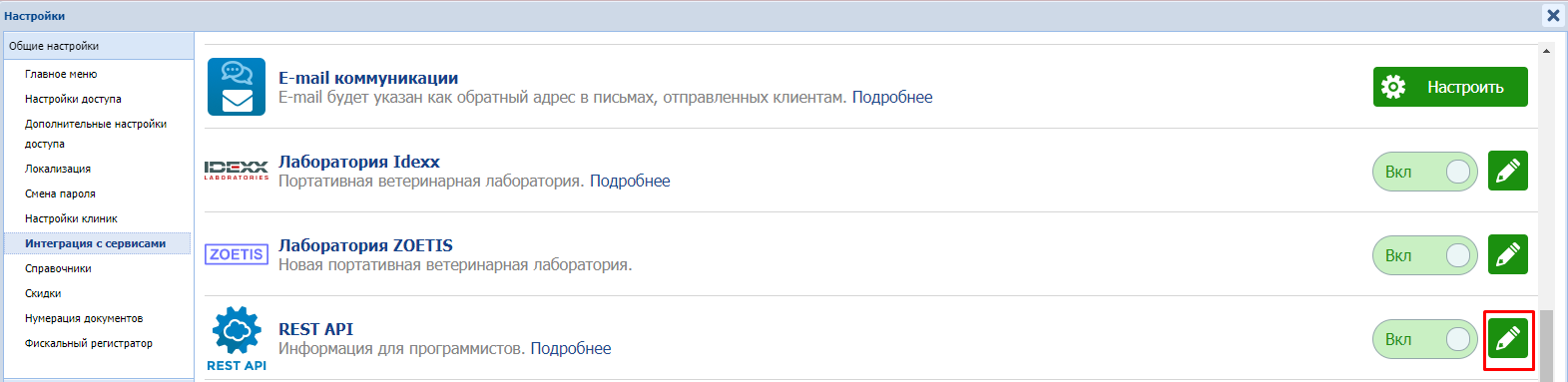 Для настройки электронной очереди необходимо скопировать API-ключ. Для этого перейдите в Настройки - Интеграция с сервисами - REST API - нажмите карандаш.