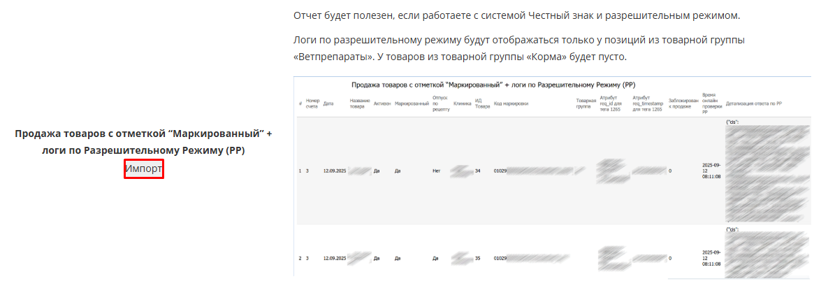 3. На странице обменника найдите отчет с названием "Продажа товаров с отметкой “Маркированный” + логи по Разрешительному Режиму (РР)". Рядом с отчетом нажмите кнопку "Импорт".