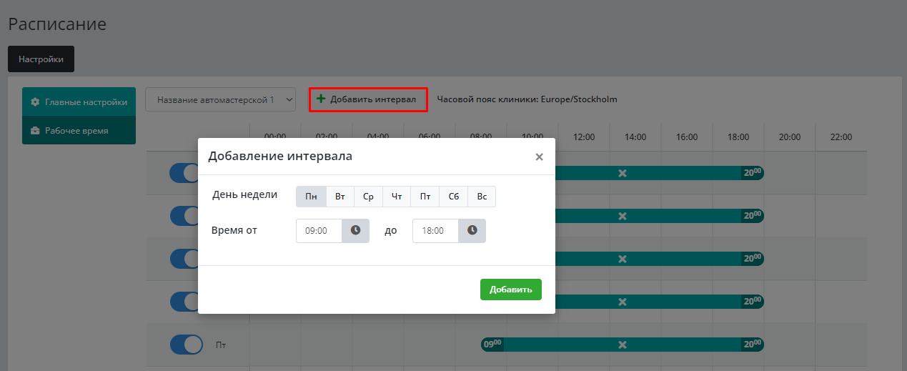В админ-панели перейдите в Настройки. Здесь можно добавить Расписание, Исполнителей, Услуги, Специализации и произвести другие настройки.