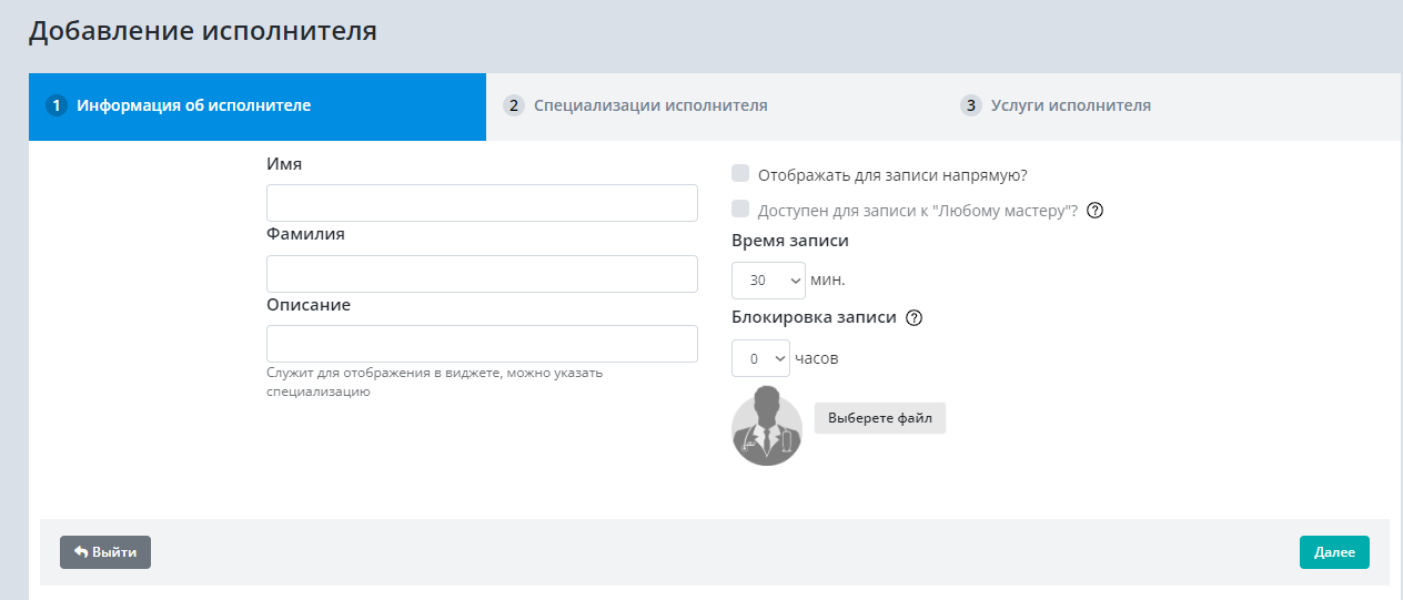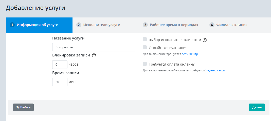 Предварительно вы можете добавить исполнителей, услуги, специализации, филиалы и график работы.