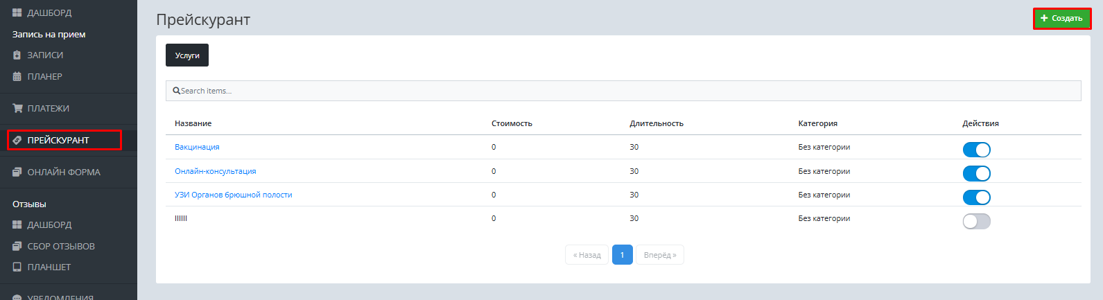 Добавьте услуги, которые оказывает ваша организация. Для этого переходим в раздел Прейскурант — Создать.