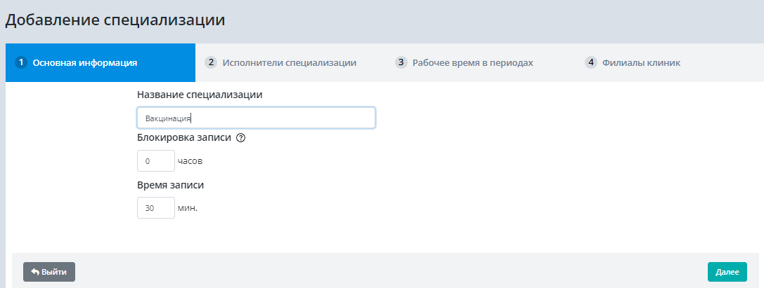 Выберите раздел Настройки — Специализации — Добавить специализацию.