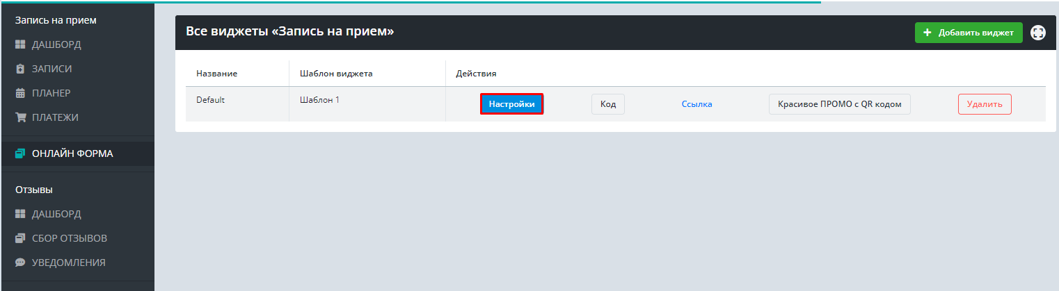 • онлайн-форма (блок, в котором вы сможете отредактировать свой виджет онлайн-записи)