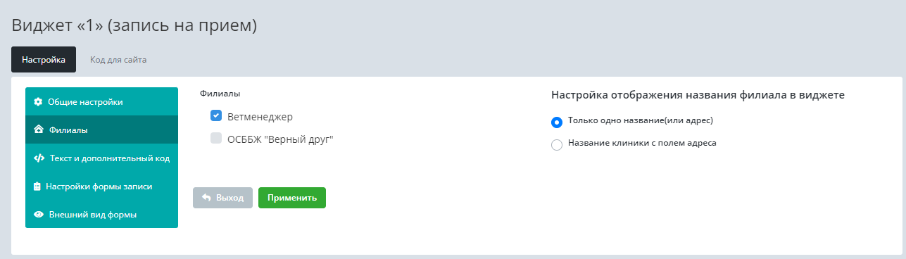 Здесь отображены все добавленные в программе филиалы; галочками можно отметить те, которые должны отображаться в онлайн-записи.